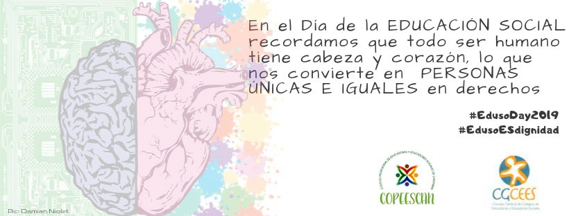 En el Día de la Educación Social recordamos que los seres humanos tenemos cabeza y corazón, lo que nos convierte en personas únicas e iguales en derechos. Cabeza porque el conocimiento facilita ideas, proyectos, visión, atención. Corazón porque la voluntad nos anima a seguir trabajando, estar cerca, sentir. Piernas para acompañar y avanzar. Brazos para construir y compartir. Sentidos para percibir. Porque somos humanos y circulamos por las redes de la vida en compañía. Porque somos Educación Social. “Nos iguala como personas únicas la capacidad de razonar y de emocionarnos con total libertad.” Desde el Consejo General de Colegios Oficiales de Educadoras y Educadores Sociales animamos a todas y a todos los/as profesionales a reivindicar su trabajo y a visibilizarlo como herramienta transformadora, buscamos unirnos ante los retos de implantar nuestra figura en más ámbitos y luchar contra el intrusismo en todos los ámbitos de la Administración Pública y de las empresas y entidades privadas. En el VII Congreso Estatal, celebrado en Sevilla, nos comprometimos a “poner en el centro de nuestra acción socioeducativa a las personas, los colectivos y los entornos más vulnerables de nuestra sociedad, desde una posición ética, dando voz a la ciudadanía y generando contextos dialogantes y participativos reales que posibiliten un nuevo pacto social para la convivencia.” La educación social es un derecho de la ciudadanía por lo que, desde las organizaciones colegiales y el ejercicio de nuestra profesión, debemos dirigir una mirada esperanzadora a un futuro en el que la Ley de Educación Social sea un hecho y, con este objetivo, continuamos hacia el VIII Congreso Estatal de Educación Social, que se realizará en Zaragoza, en abril de 2020, bajo el lema “Educación Social: Dignidad y derechos”. Barcelona, octubre de 2019