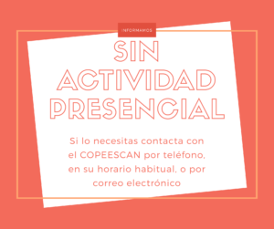 La atención presencial en la oficina del COPEESCAN queda suspendida, hasta nuevo aviso. La secretaría técnica, adoptando las medidas recomendadas por el ministerio de sanidad, realizará teletrabajo. Creemos que es la mejor decisión por responsabilidad social.